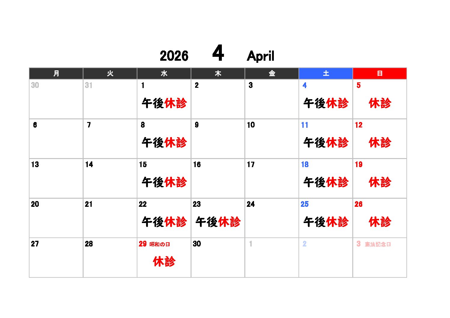 4月の休診日のお知らせです。